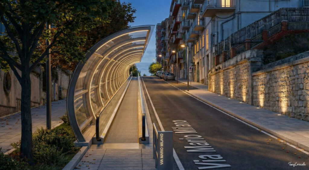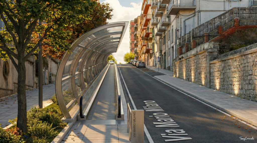 Tapis Roulant potrebbero, quindi, essere inseriti sulla discesa del Panfilo oppure, in seconda analisi, sul “costone” che porta alla Piazza S. Antonio. Queste soluzioni permetterebbero di evitare ai pedoni la faticosa “salita del Panfilo”; inoltre, risolverebbero anche (e non è poca cosa!) il problema delle BARRIERE ARCHITETTONICHE, DANDO AI DISABILI E ALLE CARROZZINE PER NEONATI LA POSSIBILITÀ DI ACCEDERE AL MARE.