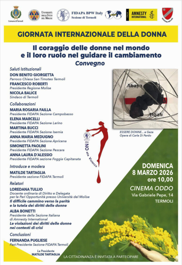 TERMOLI – Domenica 8 marzo 2026, presso il Cinema Oddo di Termoli, si è tenuto l’atteso convegno dal titolo “Il coraggio delle donne nel mondo e il loro ruolo nel guidare il cambiamento“. L’evento, promosso e organizzato dalla sezione FIDAPA di Termoli, ha riunito esponenti istituzionali, esperte di diritto e rappresentanti di diverse sezioni FIDAPA per riflettere sul lungo e tortuoso percorso dell’emancipazione femminile.