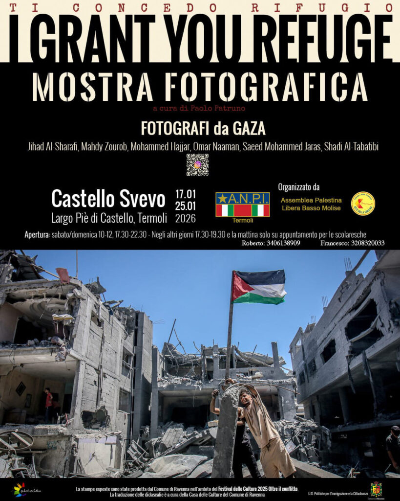 La locandina sulla mostra fotografica organizzata dall’ANPI di Termoli al castello svevo dal 17 al 25 gennaio sui disastri a Gaza.