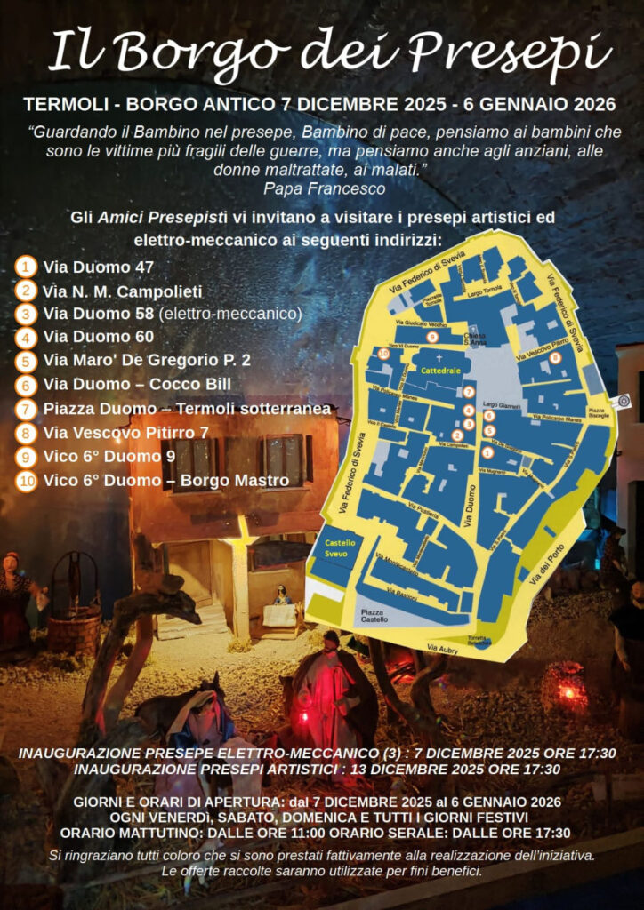 TERMOLI – Il suggestivo Borgo Antico è tornato a essere protagonista con la terza edizione del Borgo dei Presepi, un percorso unico tra presepi artistici ed elettro-meccanici che raccontano la magia del Natale. L’iniziativa, organizzata dagli Amici Presepisti, è visitabile fino al 6 gennaio 2026, ogni venerdì, sabato, domenica e nei giorni festivi, con aperture mattutine dalle ore 11:00 e serali dalle ore 17:30.