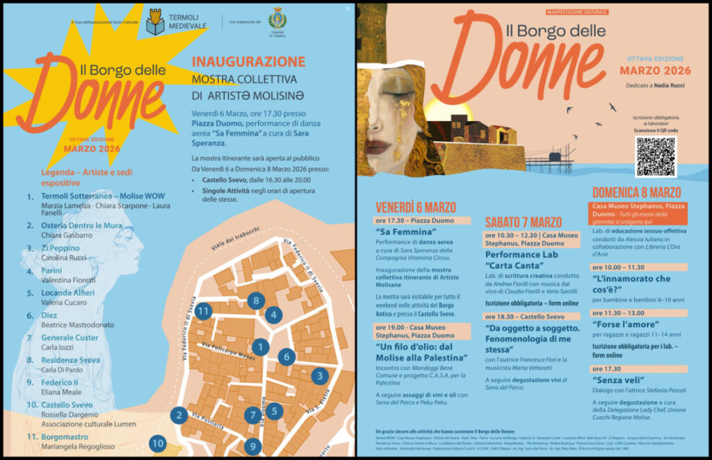 TERMOLI – L’ottava edizione de “Il Borgo delle Donne” torna protagonista ad animare il Borgo Antico di Termoli dal 6 all’8 marzo, trasformando il cuore storico della città in un crocevia vitale di cultura, incontri e riflessione. La manifestazione socio-culturale, organizzata in concomitanza con la Giornata Internazionale della Donna, si pone come momento di festa ma soprattutto di lotta attiva. Le organizzatrici spiegano, infatti, che l’obiettivo è celebrare le conquiste femminili e rinnovare l’impegno quotidiano: “perché si celebrano i diritti acquisiti dalle donne e ci si impegna per far sì che questo processo, estremamente necessario, continui per raggiungere la parità di genere e l’uguaglianza dei diritti e delle opportunità per tutte le donne e per tutte le persone che non si riconoscono nel binarismo di genere”. Un impegno ritenuto ancor più cruciale in un periodo storico in cui i diritti fondamentali appaiono gravemente minacciati, spingendo le promotrici a offrire “uno spazio aperto a tutte e tutti, in un clima di rispetto e gentilezza, che speriamo possa davvero promuovere un cambiamento reale”.