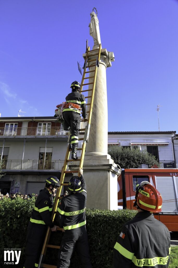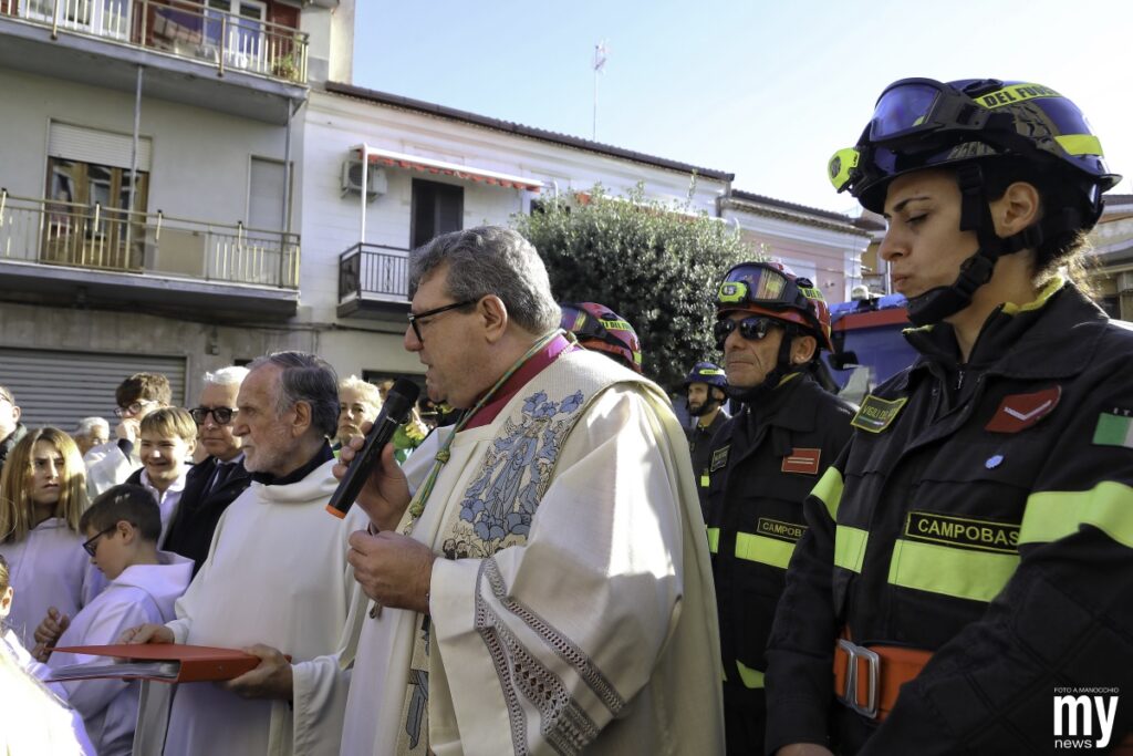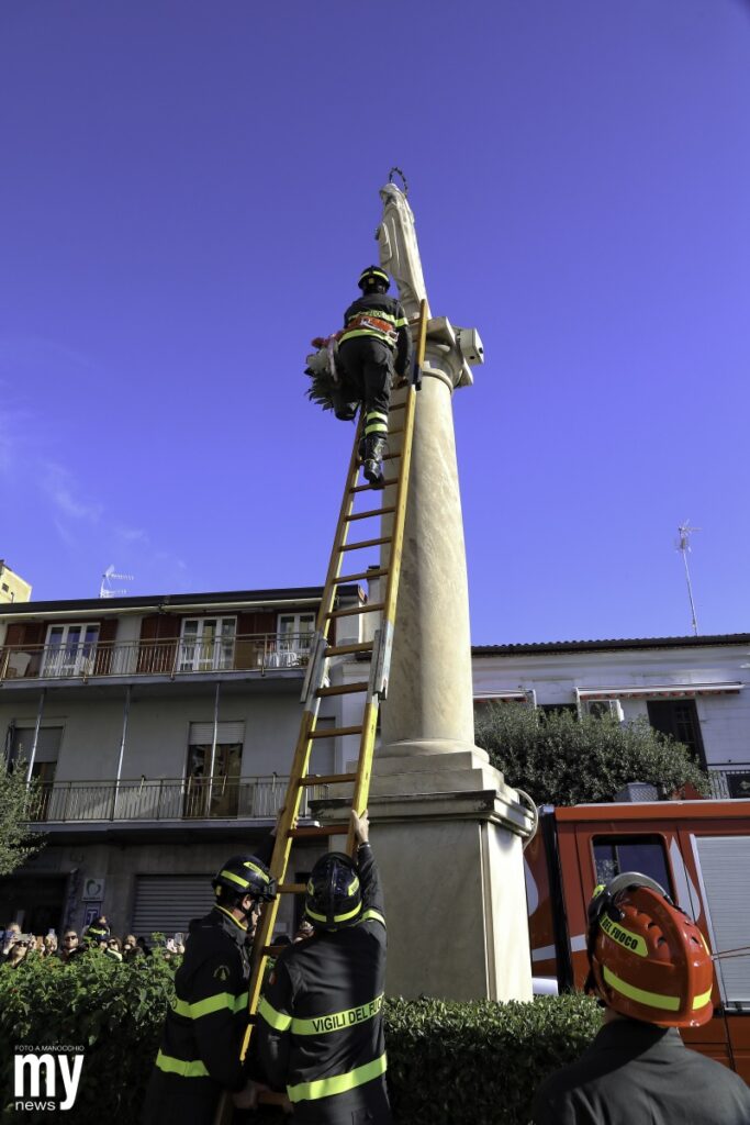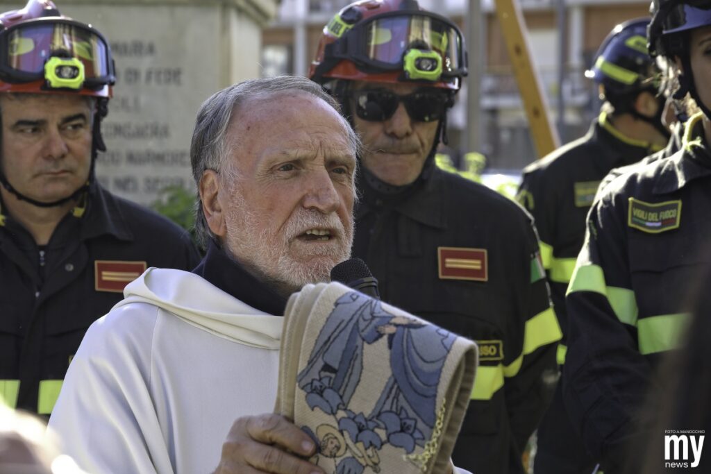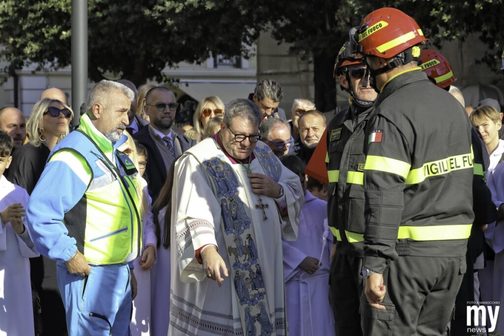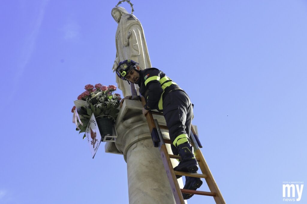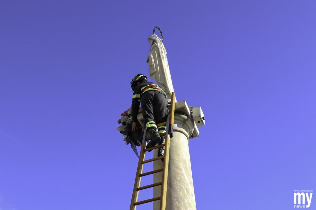 Dopo la recita dell’Angelus, il Vescovo ha rivolto il suo saluto alla città con un messaggio di speranza: «Che questa giornata sia segno di unità e di fede per tutta la comunità». Subito dopo, i Vigili del Fuoco hanno deposto l’omaggio floreale ai piedi della statua della Vergine, utilizzando la scala per raggiungere la Madonnina.