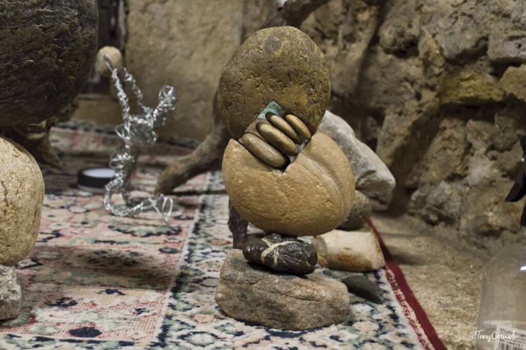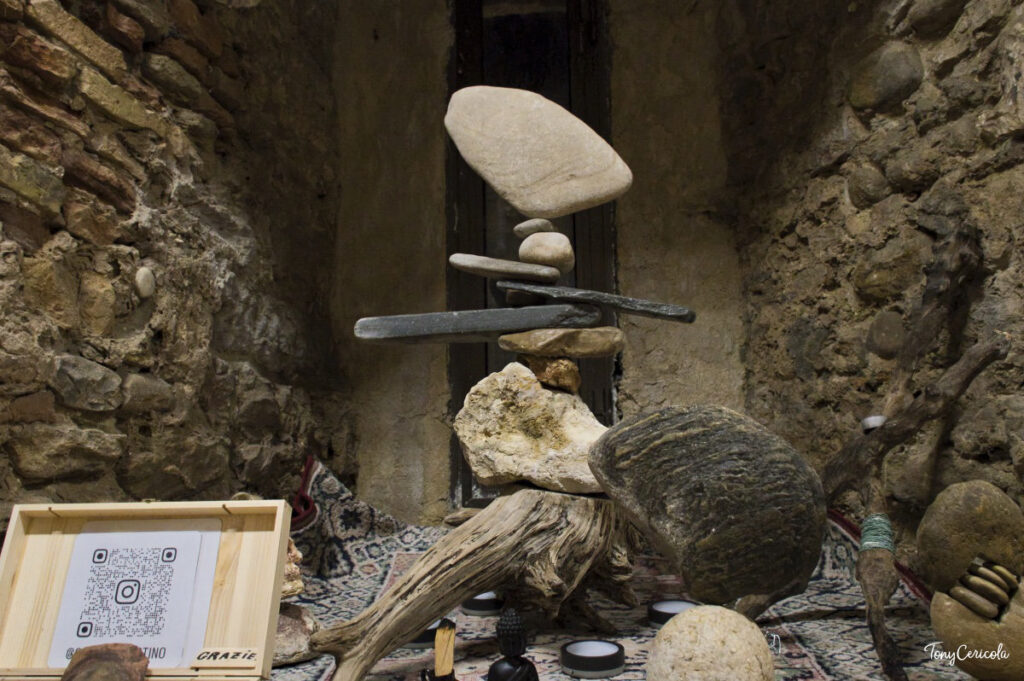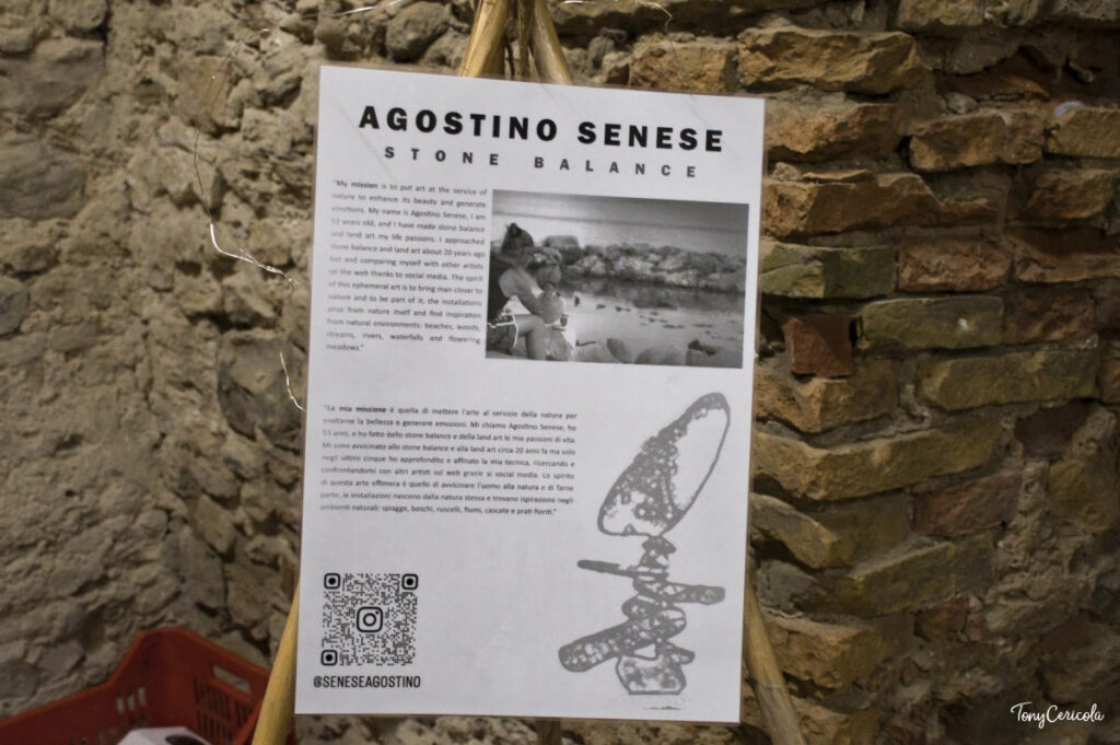 Spazio anche alla Land Art con Agostino Senese, che da oltre vent’anni si dedica allo stone balance in ambienti naturali – spiagge, boschi, fiumi, cascate. «La mia missione è quella di mettere l’arte al servizio della natura per esaltarne la bellezza e generare emozioni», si legge nel suo pannello. Lo spirito della sua ricerca, si specifica in mostra, è «quello di avvicinare l’uomo alla natura e di farne parte».