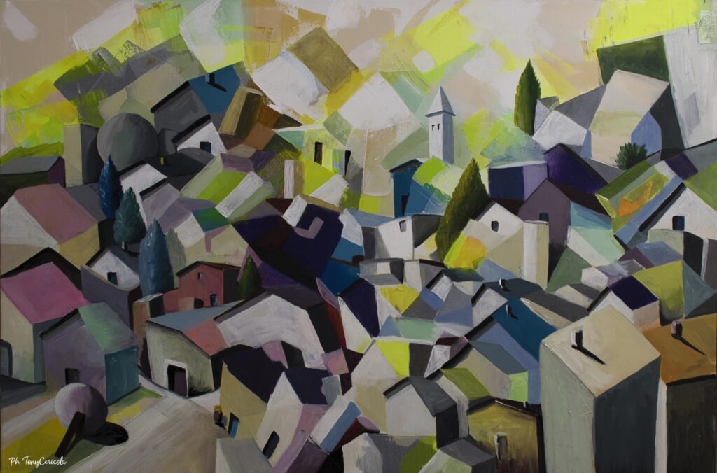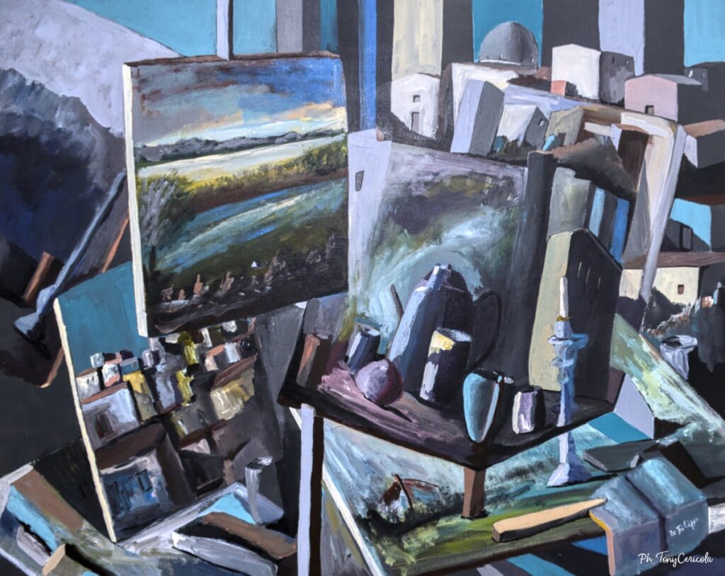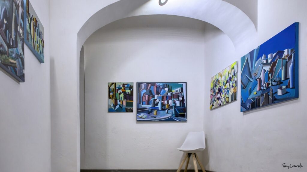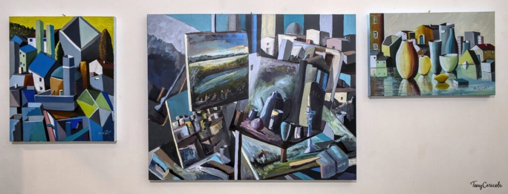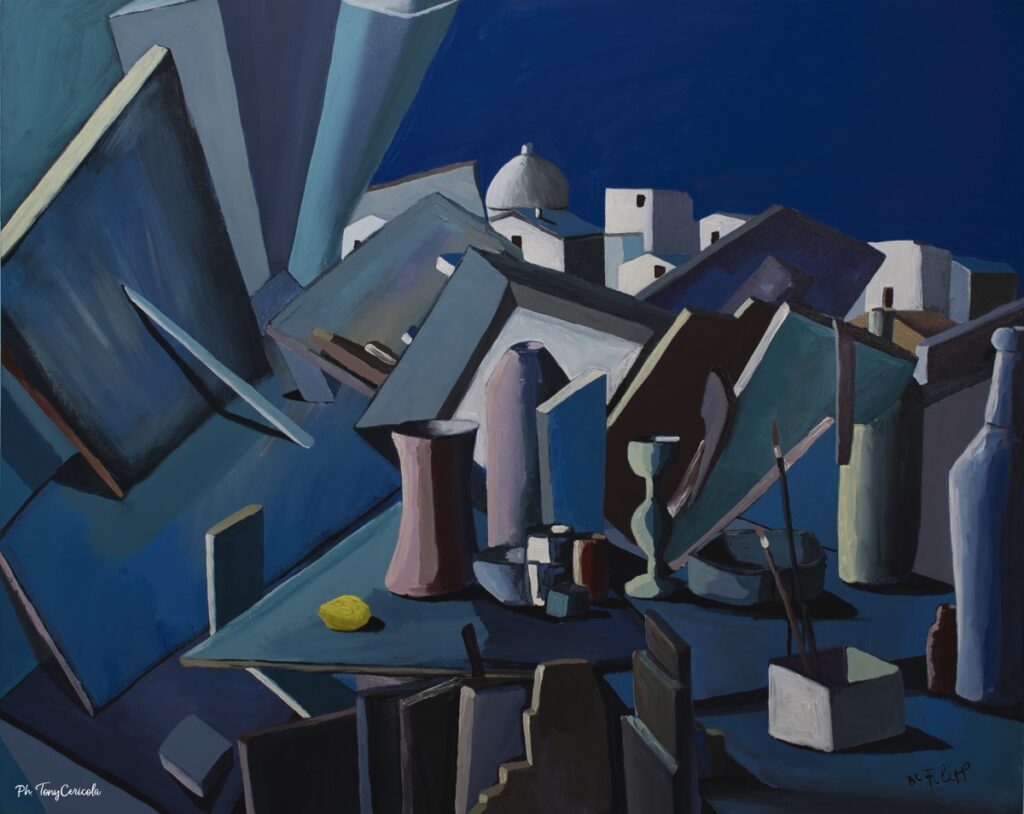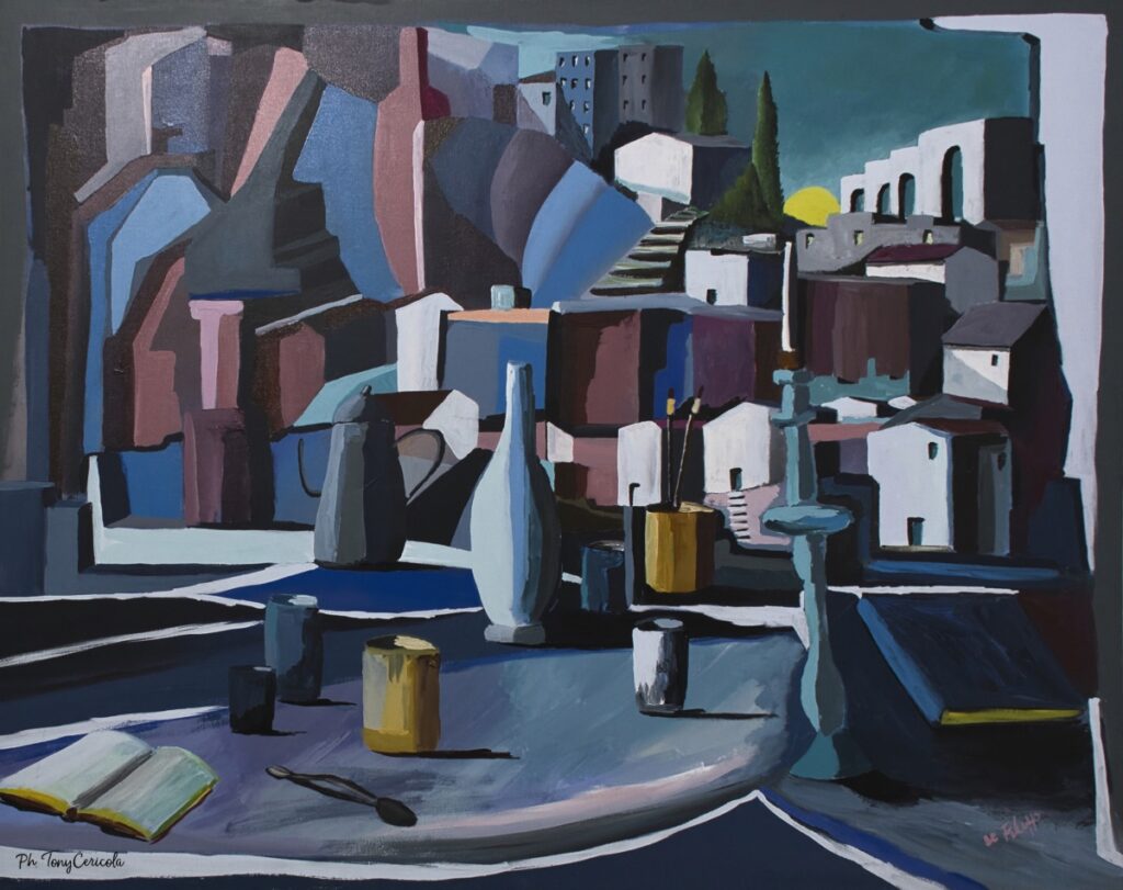 Nelle sue opere prendono forma scorci urbani, quinte architettoniche e oggetti del quotidiano – brocche, bicchieri, libri, frutta – collocati in uno spazio scenico sospeso tra realtà e immaginazione. L’artista ricompone così i luoghi della propria memoria, trasformandoli in una nuova allegoria del creato, dove ciò che è familiare diventa simbolico.