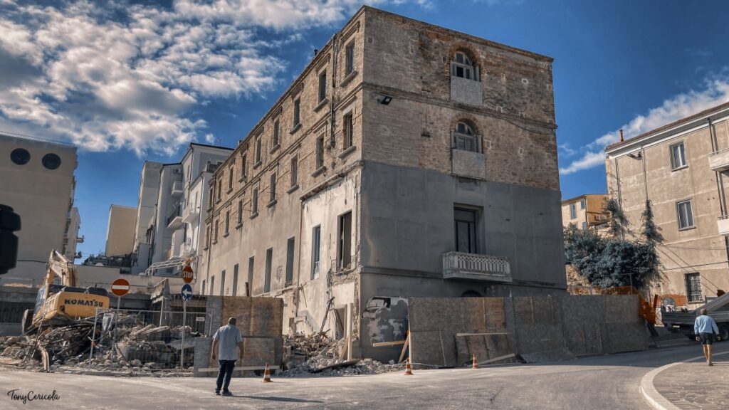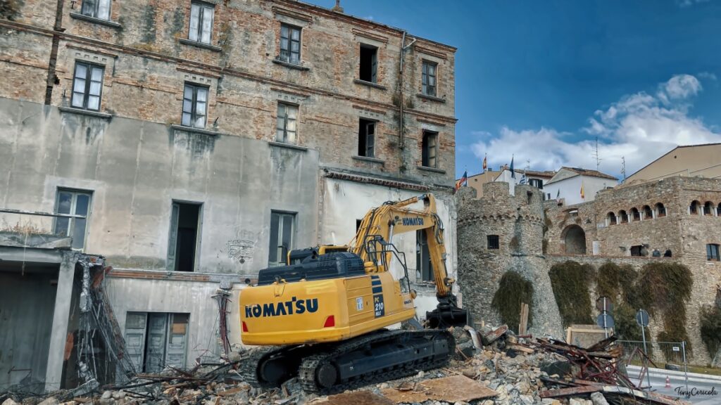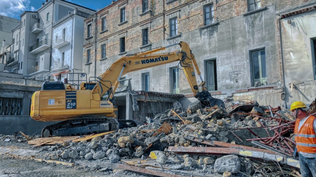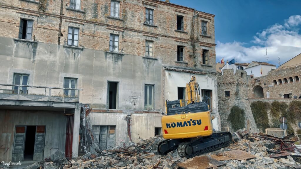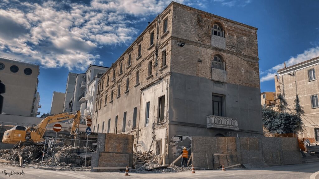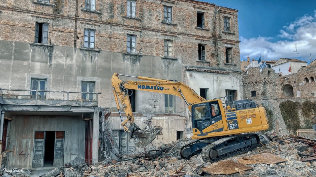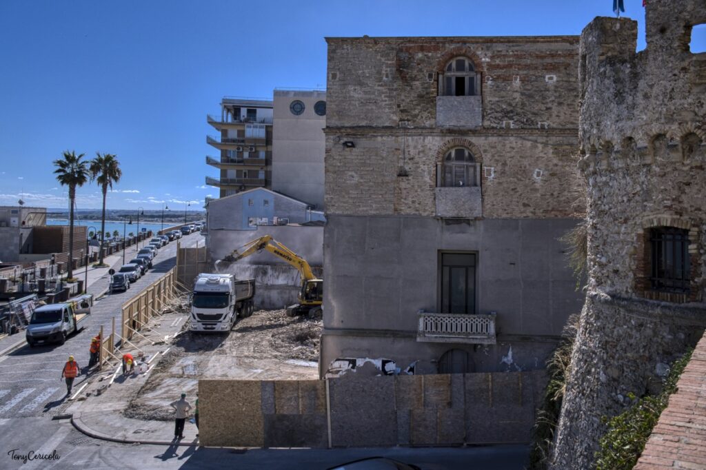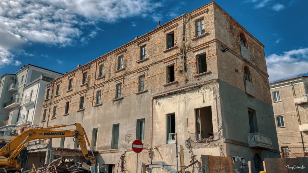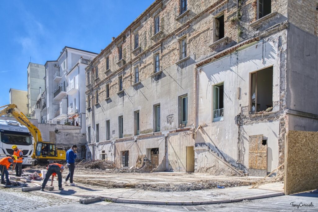 TERMOLI – Dopo oltre quarant’anni di attesa, Palazzo Crema torna protagonista della trasformazione urbana di Termoli. Questa mattina sono iniziate le operazioni di demolizione parziale dell’edificio, con l’abbattimento delle strutture secondarie fronte mare, un tempo adibite a falegnameria e laboratorio per la calce.