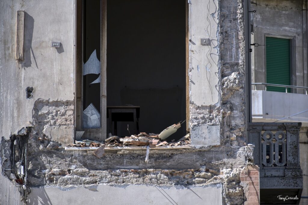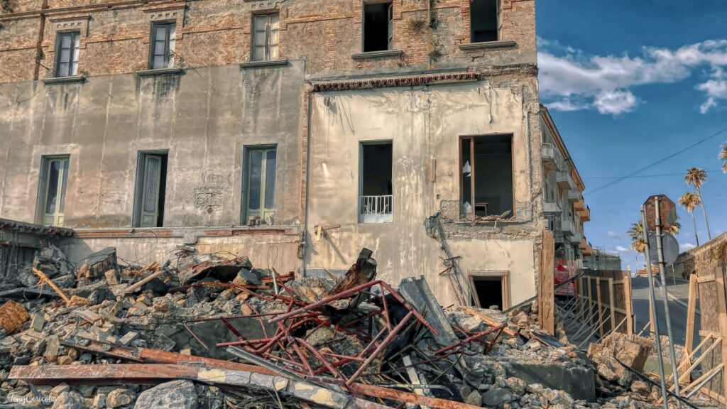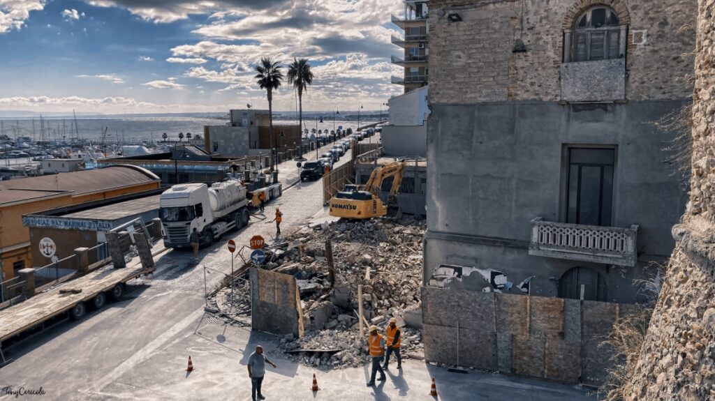Il progetto, curato dallo Studio di Architettura e Ingegneria Gammieri, è quindi entrato nel vivo con l’intervento delle ruspe e delle squadre operative, che hanno avviato la rimozione delle porzioni più degradate dell’edificio. Il cantiere, visibile da via Aubry, si presenta oggi come un vero scenario di rigenerazione: macerie, polvere, martelli pneumatici e mezzi meccanici in azione per liberare l’area e prepararla alla fase successiva.