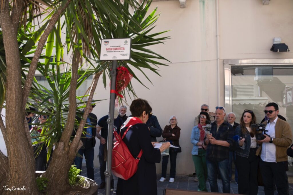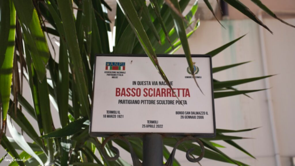 Mentre in piazza si svolgeva la cerimonia istituzionale, in via Adriatica l’ANPI e Termoli Bene Comune-Rete della Sinistra erano già radunati davanti alla targa dedicata a Basso Sciarretta, l’unico partigiano termolese. Marcella Stumpo ne ha ricordato la figura leggendo una sua poesia: «I suoi resti riposano nel cimitero del piccolo borgo di Rocca Cigliè, dove aveva combattuto come partigiano e dove teneva anche uno dei suoi studi. Coltivava la poesia: “Sento l’erba crescere sulla rocca di Cigliè. Le nuvole continueranno a correre senza fermarsi, io non morirò mai. Soltanto le nuvole continueranno a correre senza fermarsi. Questo è il miracolo, basta crederci”, firmato Basso Sciarretta, partigiano». I presenti hanno quindi intonato Bella ciao a cappella.