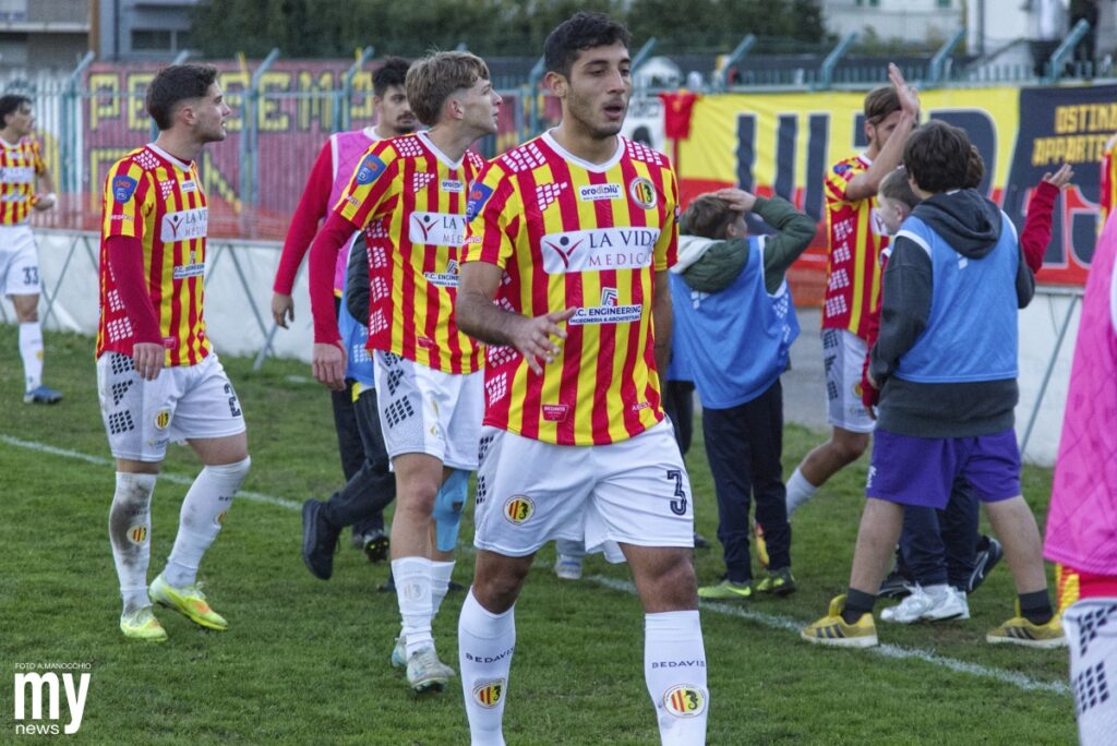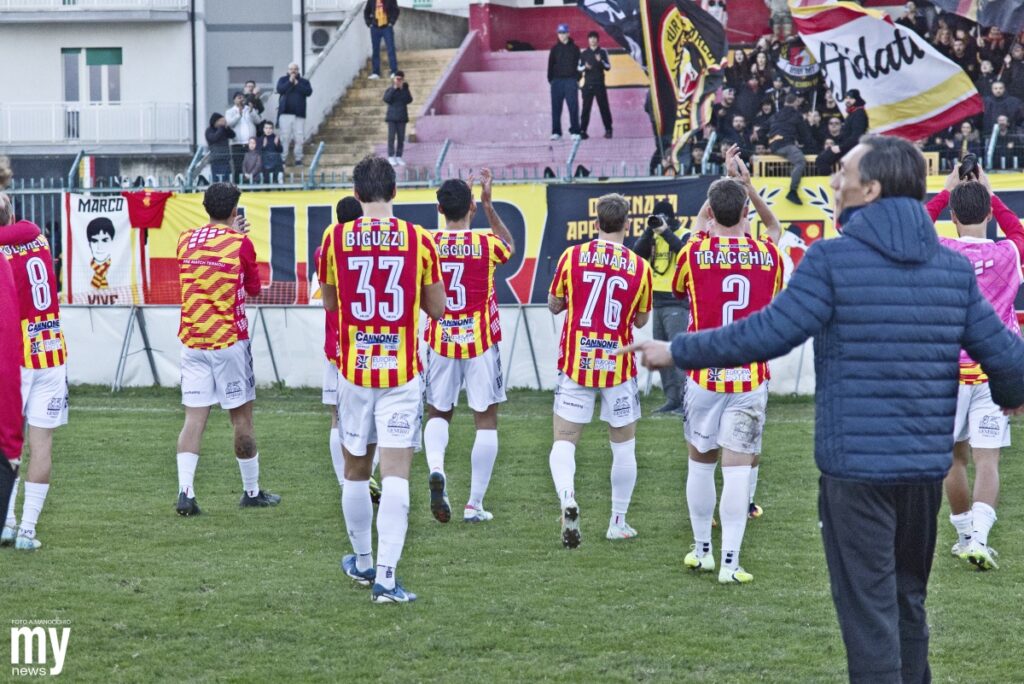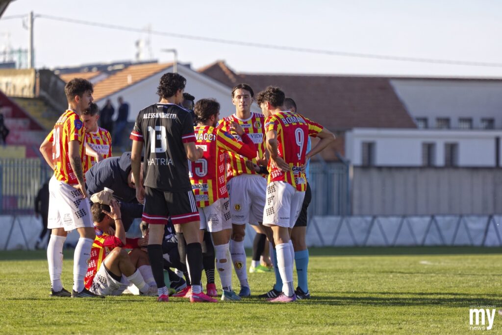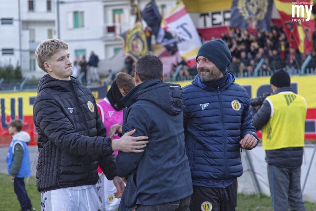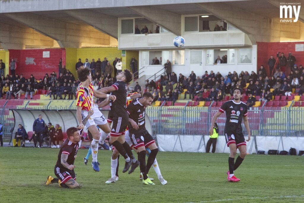 Finale al cardiopalma, a tempo ormai scaduto, con il Teramo che si ritrova a battere tre corner di fila: per ben due volte l’estremo difensore giallorosso Iannaccone vola e chiude la porta, prima su Bruni e dopo su Persani, salvando miracolosamente il risultato.