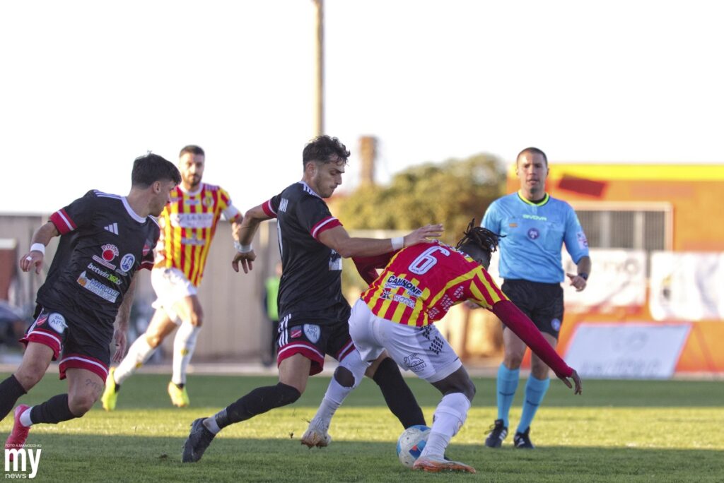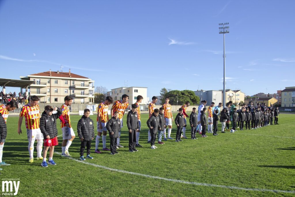 In questa giornata giallorossa lo stadio vede gli spalti gremiti e colorati della curva Guida e della tribuna ospiti. Il primo tempo parte con ritmi di gioco misurati e guardinghi, con i ragazzi di D’Adderio concentrati e pronti a contenere il potenziale offensivo degli avversari.
