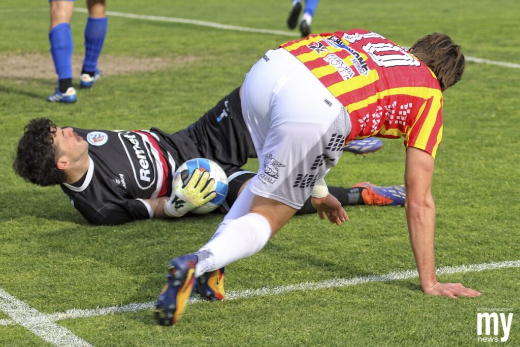 Come dicevamo, la partita ha mantenuto ritmi piuttosto blandi, con i marchigiani attentissimi nelle retrovie e che lasciano pochi spazi all’attacco giallorosso. La prima vera occasione per il Termoli arriva al 12′: su rimessa laterale di Tracchia direttamente in area, trova Magnani che fa da torre all’indietro per l’accorrente Mercuri, però la sua conclusione è centrale e il portiere forsempronese Bianchini blocca sicuro la sfera.