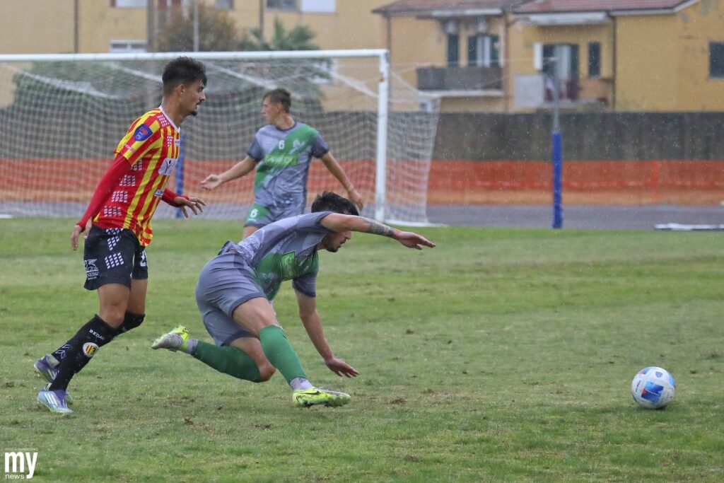 Dopo un paio di minuti è il giallorosso Biguzzi che si invola da centrocampo verso l’area marchigiana e tira una buona conclusione dalla distanza, che vola poco alta sulla traversa. Un buon tiro in area di Romano, servito da Mercuri intorno al 20’ minuto, poteva avere sorte migliore. Si vede un Termoli intraprendente e, nonostante il maestrale fastidioso e la pioggia che a tratti imperversa sul quadrato di gioco, continua a spingere e a costruire azioni offensive.